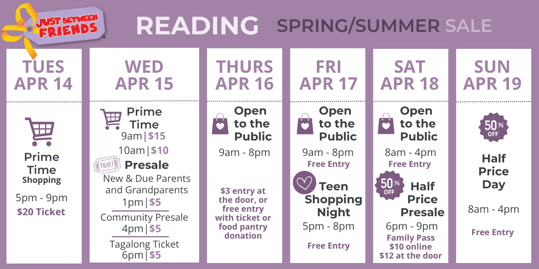 At Just Between Friends pop-up sales, you’ll find everything in one easy-to-shop place—gently-loved and new items for kids of all ages, from infant to teen (plus maternity). We inspect items for quality and safety, so you can shop confidently—and save hundreds on clothes, toys, books, gear, shoes, and more. You’ll leave with great finds, happy kids, and more money in your pocket. That’s just smart.